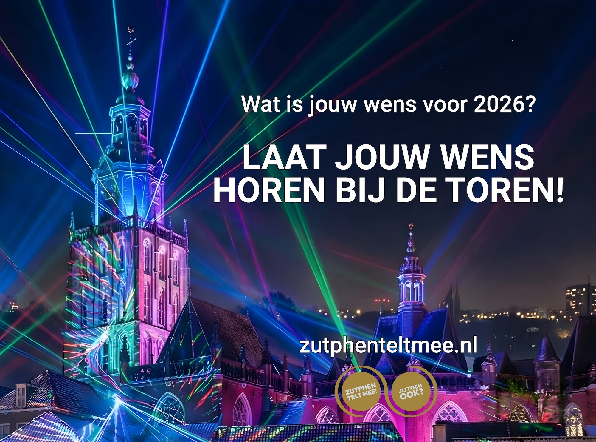 Heb jij een mooie, hoopvolle of vrolijke wens voor het nieuwe jaar? Deel ’m met ons via het formulier hieronder. Misschien klinkt jouw wens straks tijdens het gezamenlijke aftelmoment vanaf de toren. Een feestelijk moment waarop heel Zutphen even stilstaat bij wat ons verbindt.